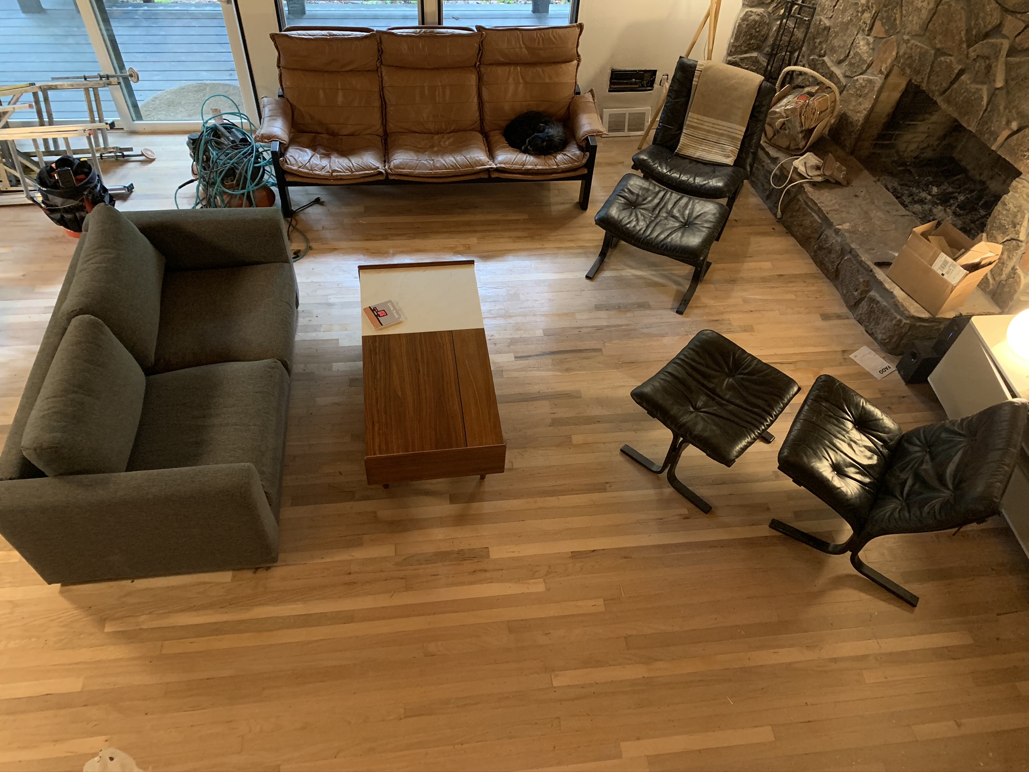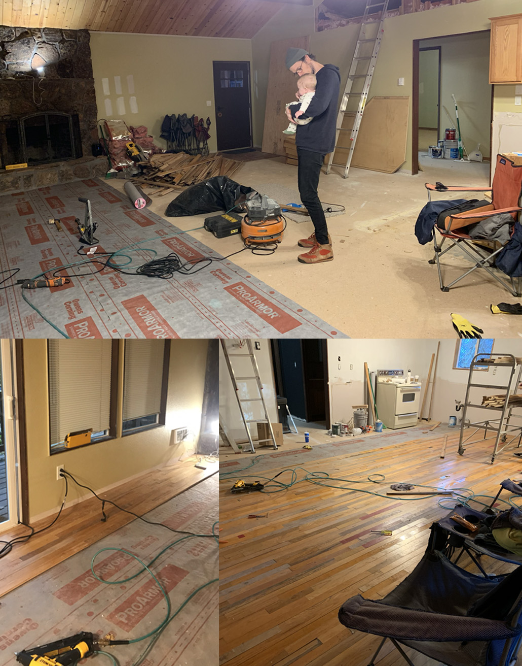 We ripped out carpet and put hardwoods throughout using salvaged wood flooring (much of which came from former school gymnasiums).