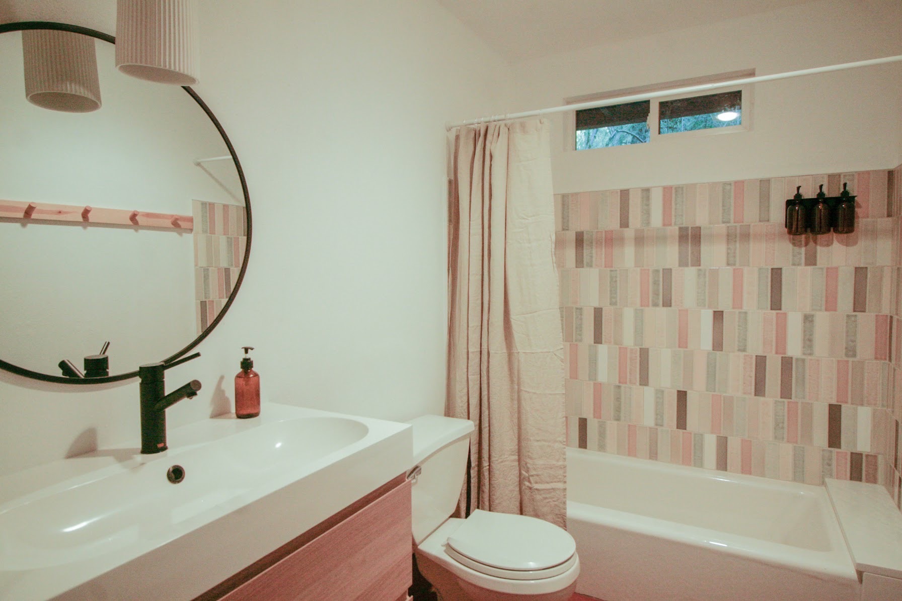 In the bathroom, a plastic tub and surround was taken out and replaced with a cast iron tub and custom tile work using handmade Pratt & Larson tiles.